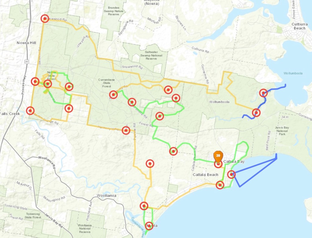 Both these legs were loops around one of the well known MTB trails in the Nowra State forest, with a little bit of off track thrown in for the trekking leg. The MTB loop was a case of finding efficient short cuts to avoid riding lots of unnecessary single track. We thought we did a good job which was confirmed when we finished to find the Avengers still in transition. The trek section was similar but in the reverse direction. Given Hugh was hobbling we decided to avoid more road bashing by taking shorter routes through the bush, which when combined with a little mistake proved not to be worth it. We also spent some time doing an extra loop at CP15 when we looking for clearings (the clue was “Clearing on Spur”) rather than sticking to the compass bearing. The Avengers were long gone by the time we got back to the bikes.